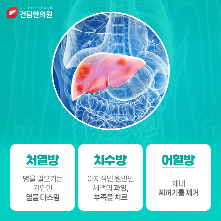 간 기능이 회복할 수가 있게 건담한의원에서는 청열방, 어혈방, 치수방 3독 제거를 통해 기능을 개선하려 도움을 드리고 있습니다.