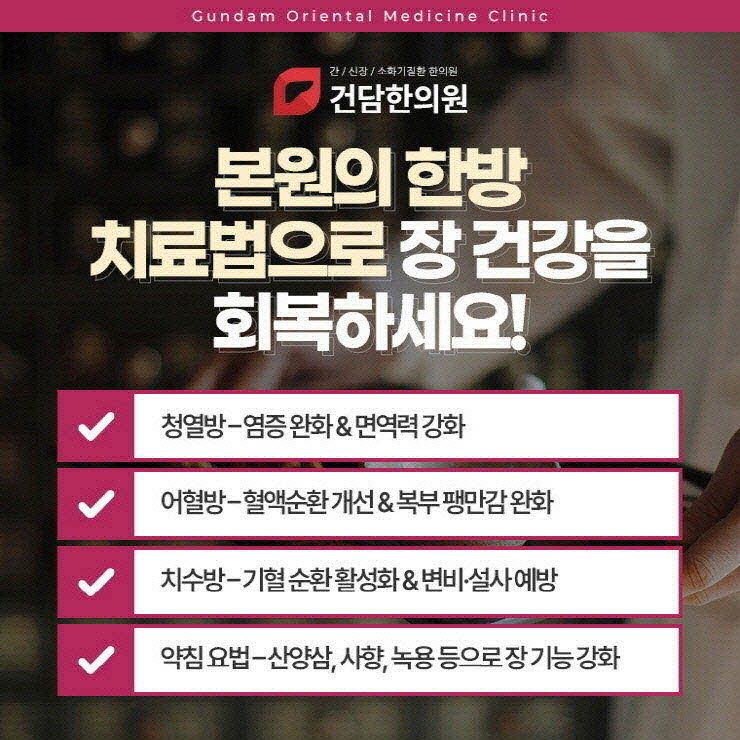 개별적인 한약 처방: 체질과 증상을 종합적으로 파악하고 기운의 흐름을 원활하게 하며 장 기능 회복을 돕는 한약을 사용합니다.