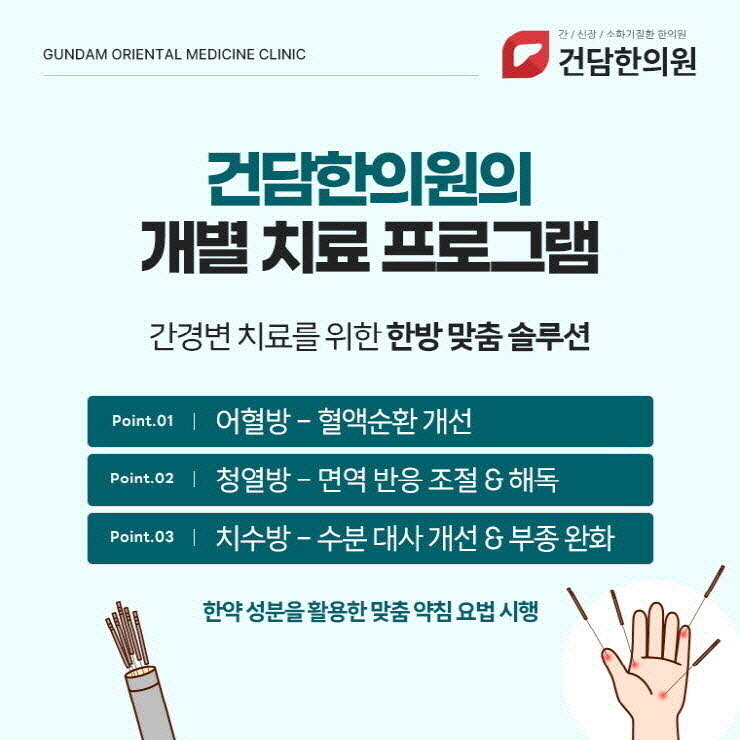 간질환원인 치료 설계의 한 축은 열독·어혈·수독의 균형을 회복하는 것입니다.